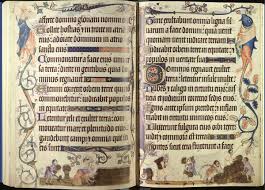 Psalters, early medieval calendars, and The Domesday Book yield fascinating information about life on a medieval estate. For instance, a scene from Saint Mary's Psalter depicts the lord's reeve overseeing the harvest. The reeve is behind the cart which is drawn by three horses and is packed full of grain. The illustration climbs the margins of the Psalter page to meet a decoration of oak leaves on one side and acorns on the other. This represents the importance for the medieval villagers of the changing seasons.
